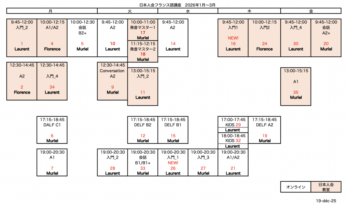 日本人会では、2026年1月12日(月)から始まるフランス語講座の生徒を募集いたします。お申し込み開始は2025年11月17日(月)です。