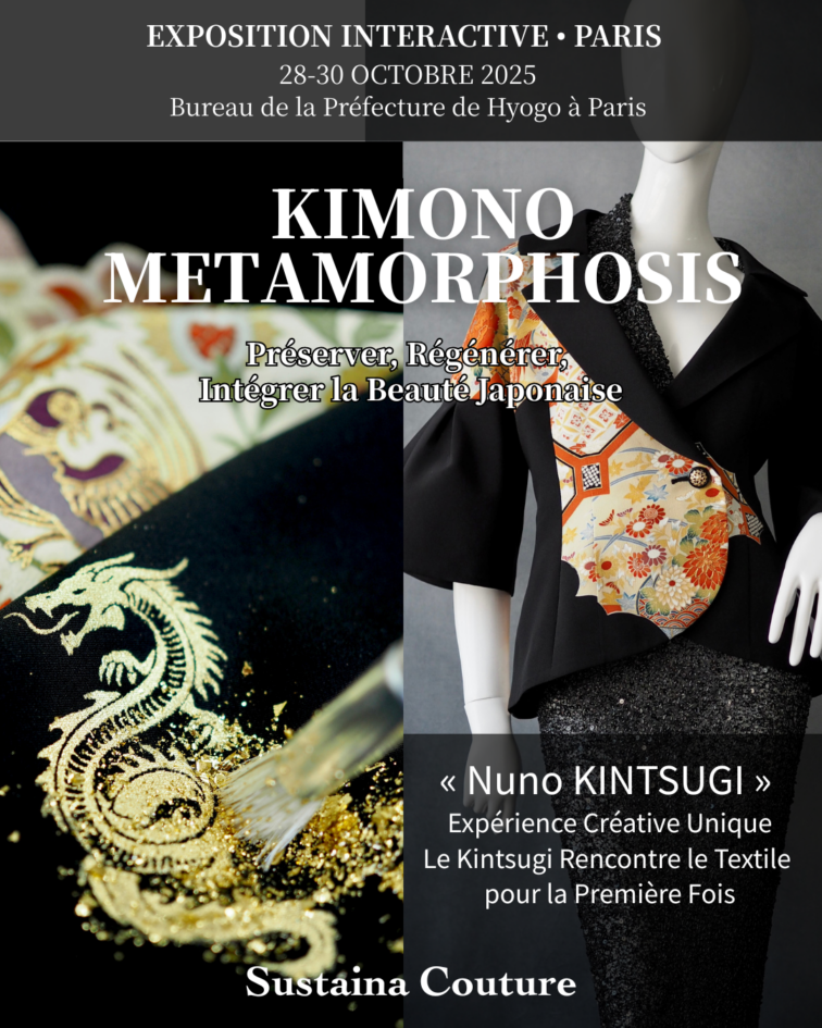 このたび兵庫県パリ事務所にて、一般社団法人Sustaina Couture au JAPON(サステナクチュール)による展示会「KIMONO Metamorphosis」を下記のとおり開催いたします。本展では、日本の伝統美を現代に呼び戻し未来へとつなぐ取り組みとして、布に金箔を施す独自の表現「布金継ぎ(FabricKintsugi)」を世界で初めて発表いたします。また、願いを結ぶ「結び(Wish-Knot)」を通じて日本文化独自の精神性「産霊(むすび)」をご体験いただけるほか、西陣織や友禅を用いたリジェネレイト作品もご覧いただけます。