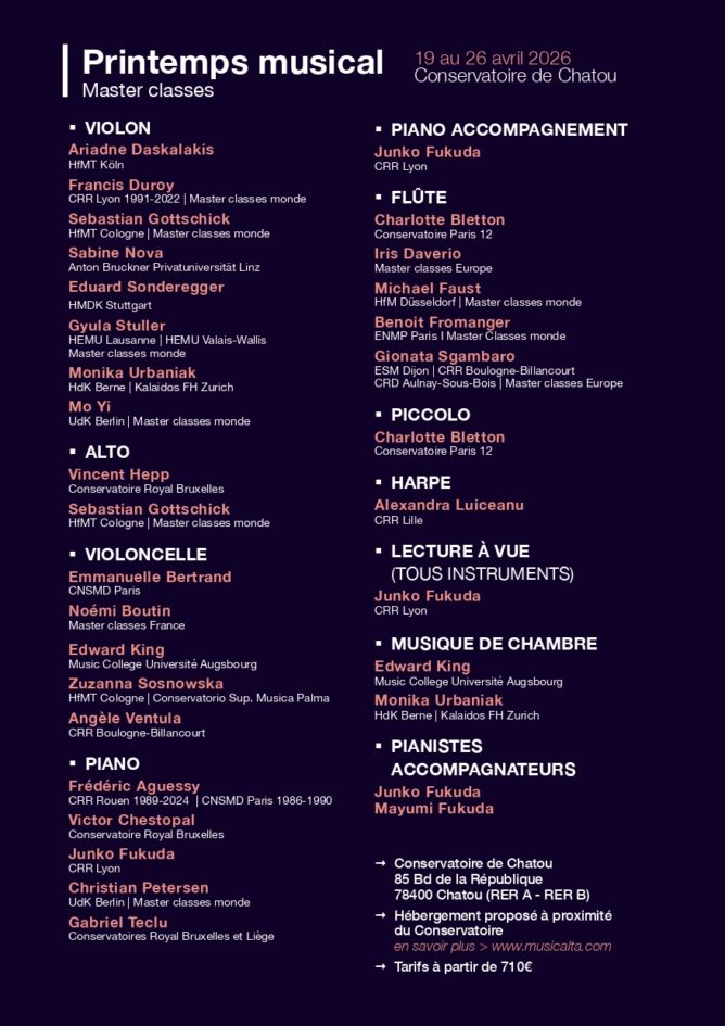 2026年4月19〜26日に、パリ郊外シャトゥーで音楽講習会が開かれ、リヨン音楽院の福田純子がピアノ伴奏法と初見講座を担当します。