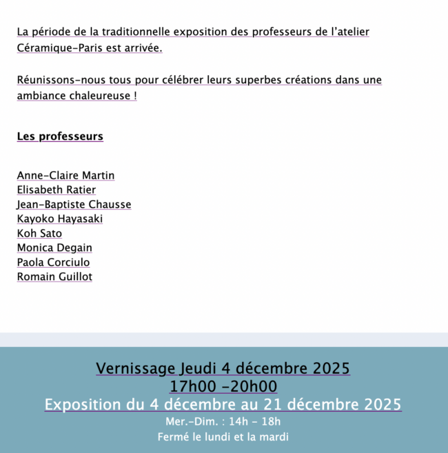 早崎さんからのメッセージ: いよいよ師走に突入、恒例の「パリ陶芸教室講師合同展」のご案内を申し上げます。お友達、ご家族お誘い合わせの上是非お越しくださいませ。皆様とお会いできるのを楽しみにしております。