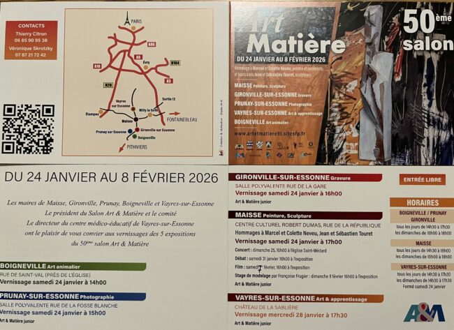 Maisse で開催される50 ème Salon Art & Matière に中作品2点と小作品1点(Fiber Art ) を出品いたします。パリからはRER D 線のご利用となりますが、お越し頂ければありがたく存じます。宜しくお願い致します。