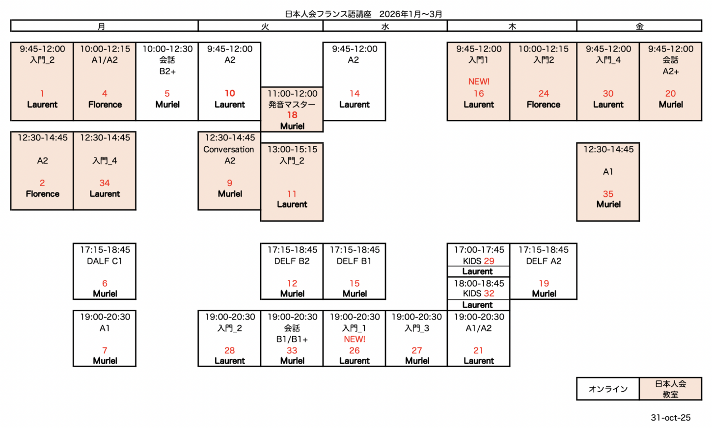 *オレンジのクラスが「教室授業(日本人会)」ホワイトのクラスが「オンラインクラス」です。