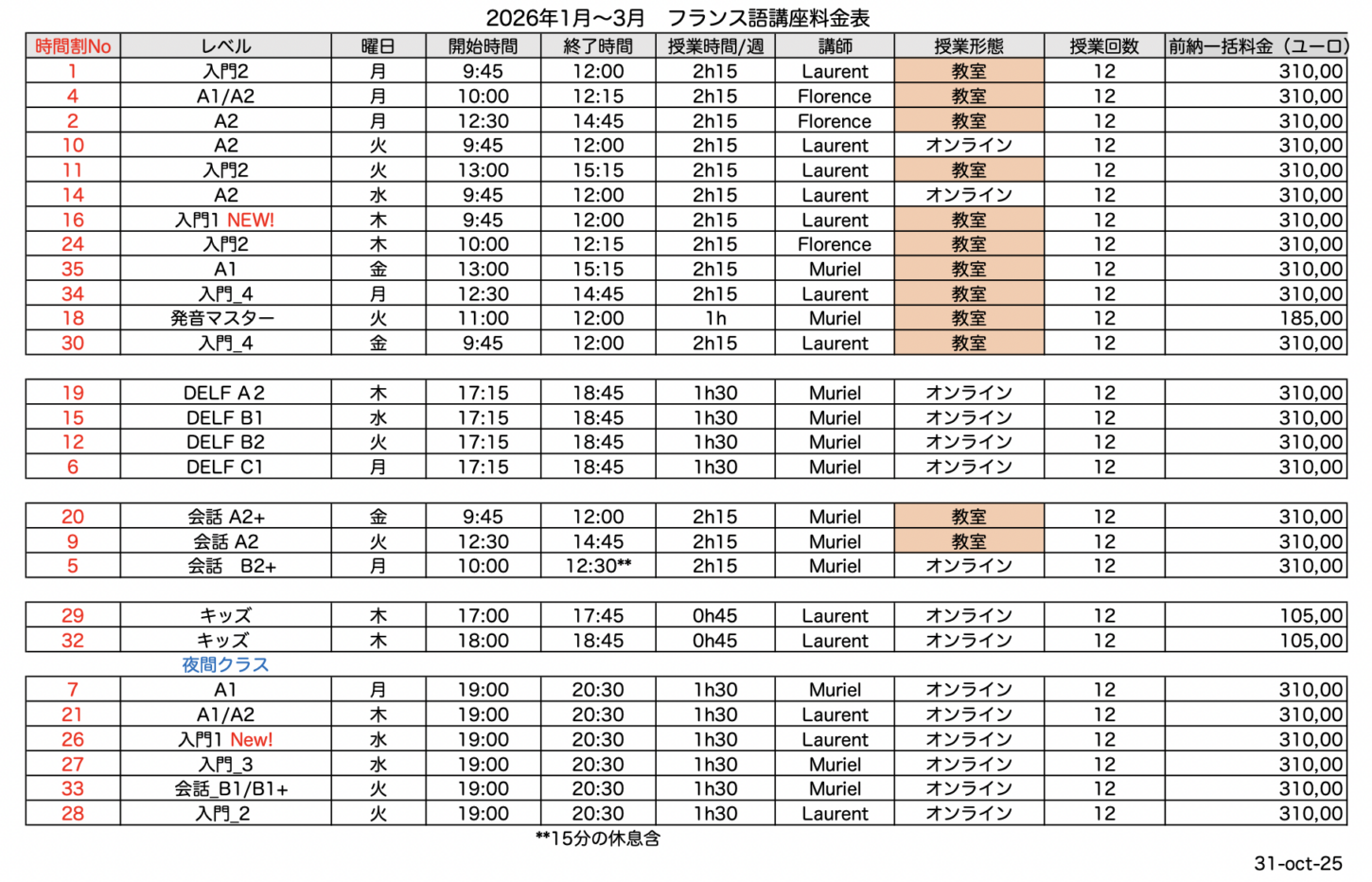 ・先生は日本人の弱点を知り、日本人の指導に精通した講師が揃っています。(DELF認定官Muriel NAVARRO講師、日本語が話せる人気のLaurent講師、日本語が話せて、フランス語学習指導修士のディプロムを持つFlorence講師によるわかりやすく的確な授業。)